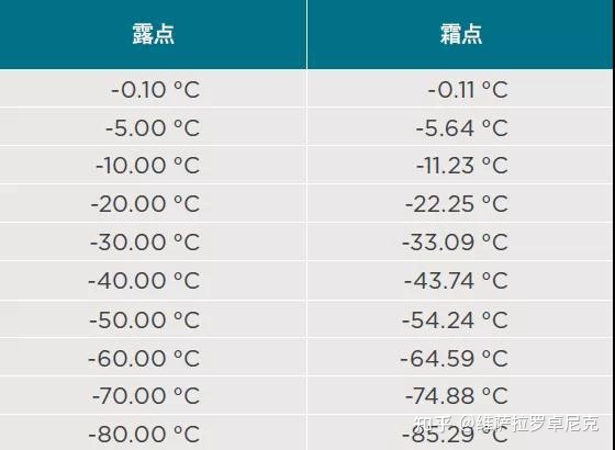 露點(Td)是含水氣的氣體在恒壓下達到飽和時的溫度。這是相對于冰點以上的溫度而言的,此時表面冷凝物是液態(tài)水。霜點(Td/f)指低于冰點時的飽和溫度,對應的表面為冰。實際上,在冷凍條件下,霜往往比露珠更早形成。